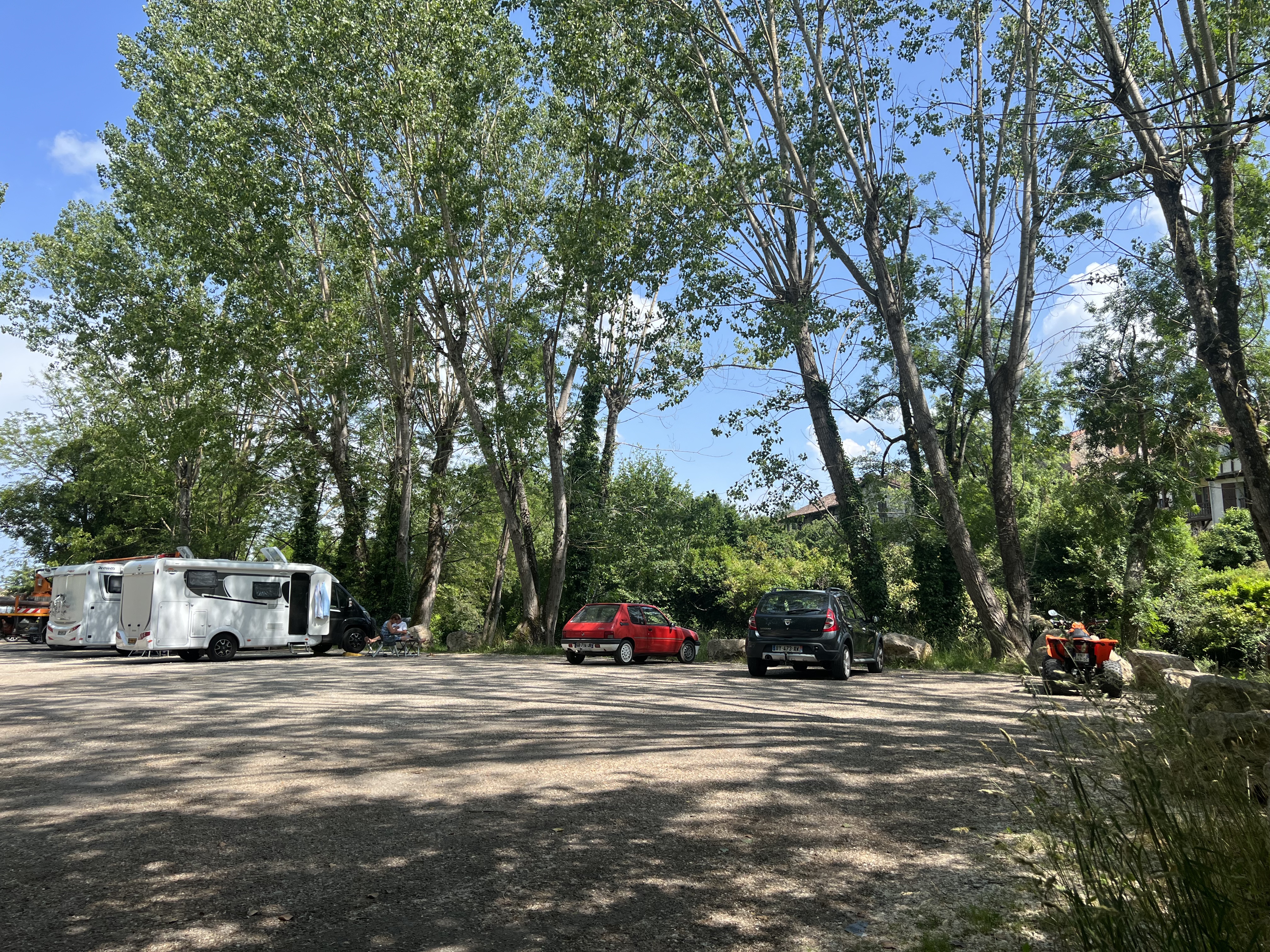 Un petit parking qui a l’avantage d’être plutôt à l’ombre, au bord de l’eau et à côté du village. Mais par contre juste à côté d’une route assez passante en journée. La borne de services est fonctionnelle pour les vidanges et le plein d’eau. Et surtout le stationnement et les services sont gratuits. Merci à la commune
